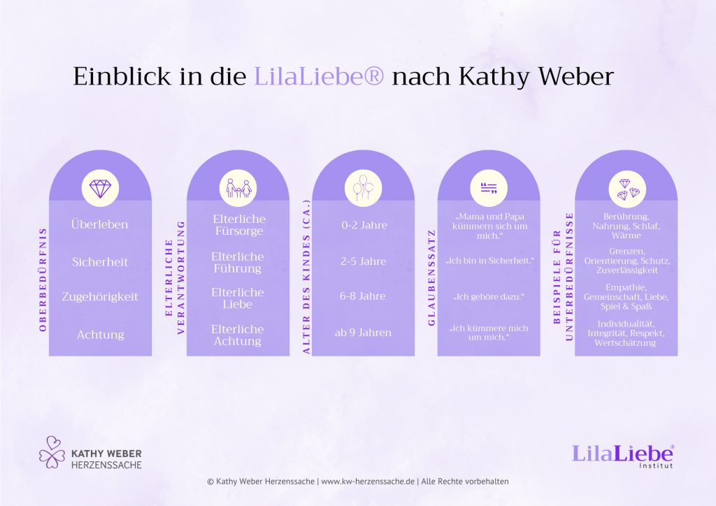 Die LilaLiebe® ist das von Kathy Weber entwickelte und zertifizierte Erziehungs- und Beratungskonzept, das die Bedürfniswelt von Kindern erklärt mit dem Ziel, das Kinder (und Innere Kinder) alles haben, was sie brauchen, um fundierte Bindung zur entwickeln. LilaLiebe® bedeutet übersetzt: „Ich habe alles, was ich brauche.“